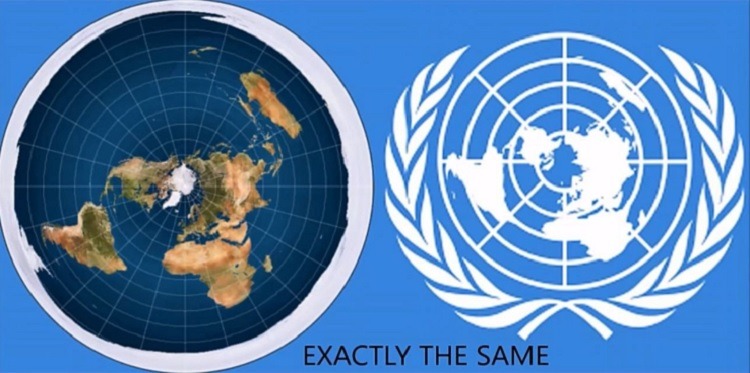 Ukázka zamlčované pravdy o našem skutečném životním prostoru. Ta pravda je také znázorněna v logu OSN [2]. Ohně symbolizují naše kontinenty a celý náš prostor je obehnán ledovou zdí.